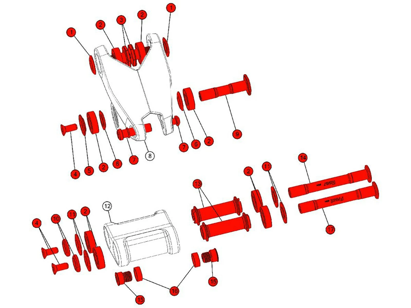 Included in the box : 2 axles, 4 long bolts, 2 axle nuts, 6 bolts, 8 bearing, 2 bushings, 11 spacers, 1 circlip, 2 o rings