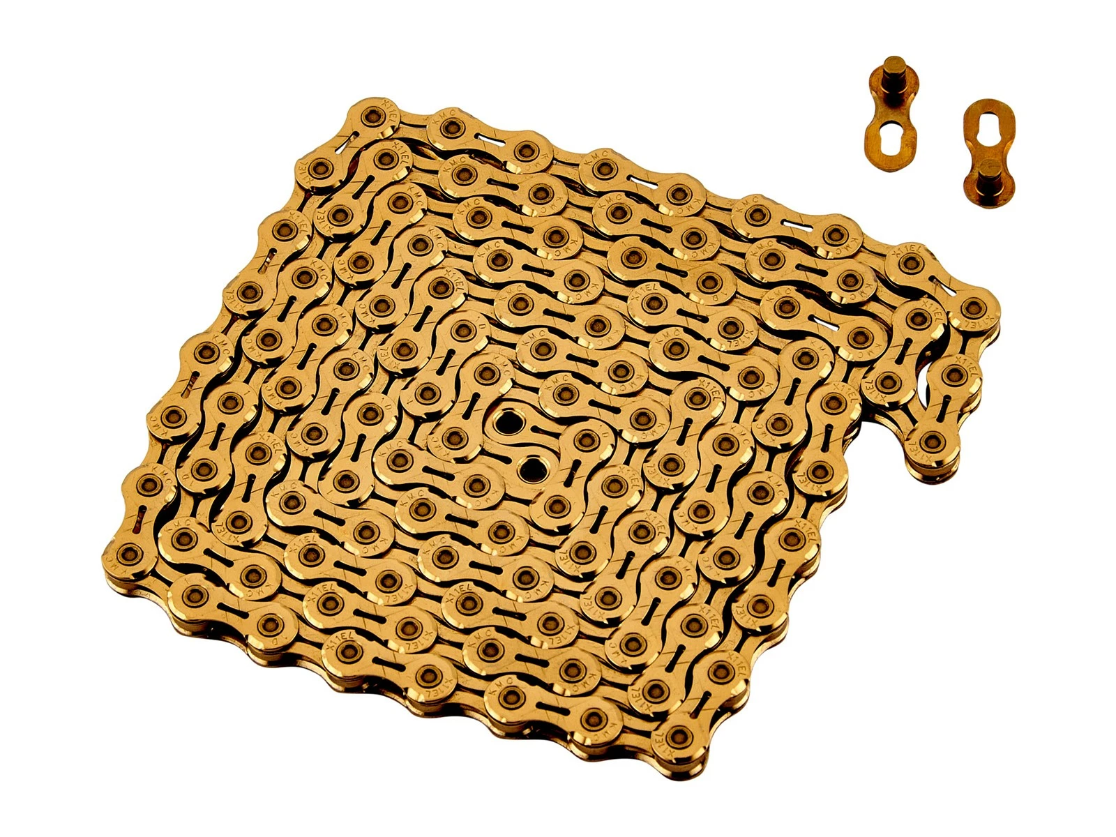 La chaîne KMC X11EL Ti-N or est une chaîne très haute performance compatible avec les systèmes 11 vitesses Route et VTT proposée à un prix modéré.